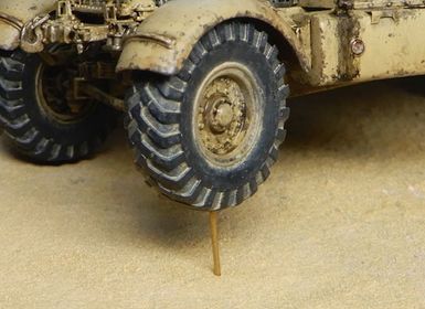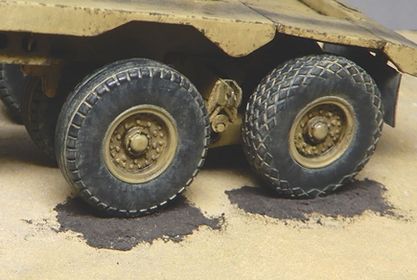 タイヤの底面はヤスリで削って平らにしてありましたが、うまくベースの凹凸を合わなかったため、後部タイヤの周囲に紙ねんどを追加で盛って接地面積を増やして、積載物の重量で沈んだ状態を再現しました。(そのあとこの部分だけ情景テクスチャーペイントでリタッチして周囲の地面に馴染ませました。)