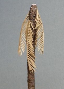 幹の途中にあるヒゲのような枯れた葉脈の残滓は、余ったヤシの葉の先端部をカットして使いました。葉は「紙創り」です。