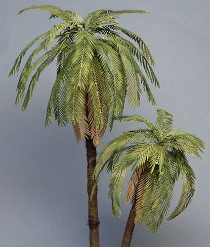 ナツメヤシはココナツヤシのようにしなだれるのではなく、放射状に伸びているような画像が多かったので、2セット使ってワサワサと茂らせてみました。