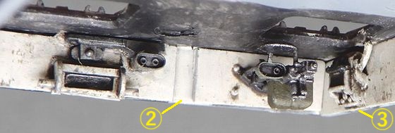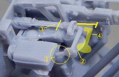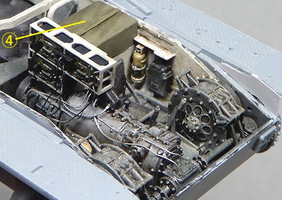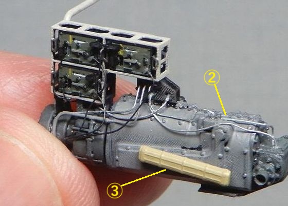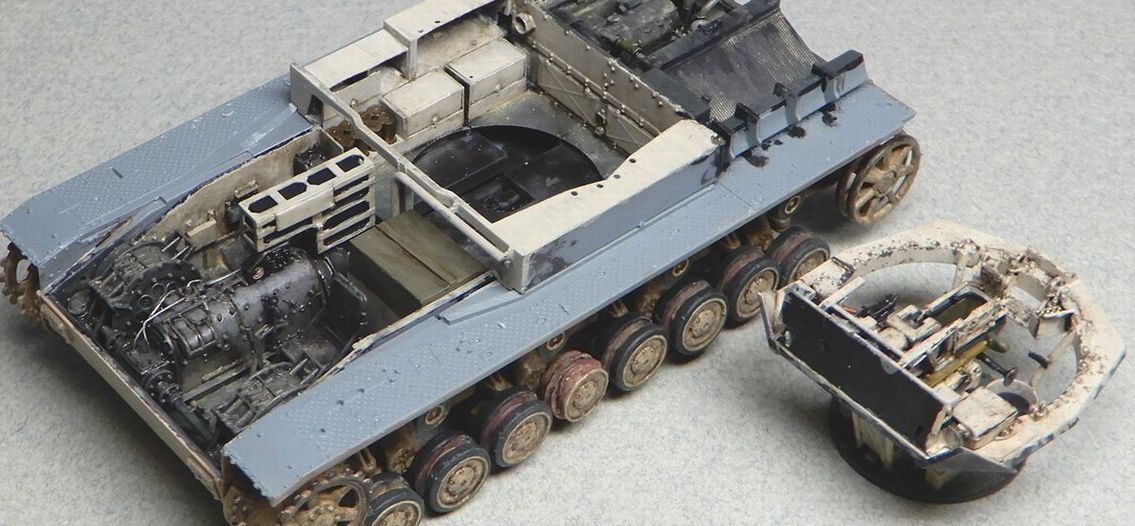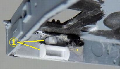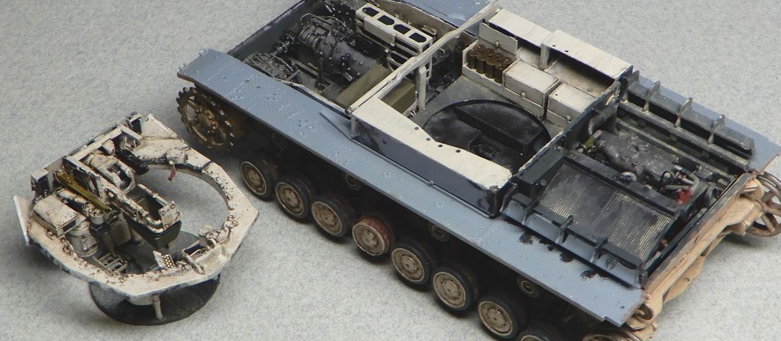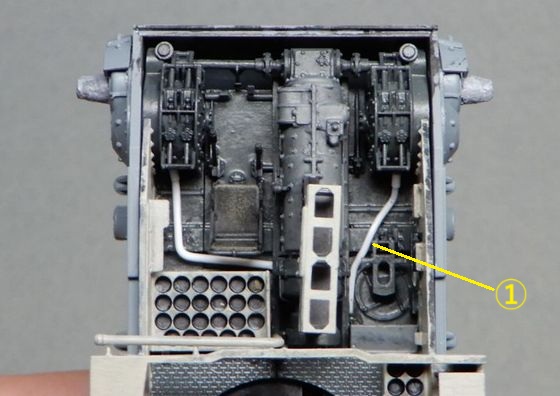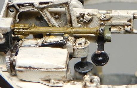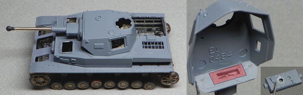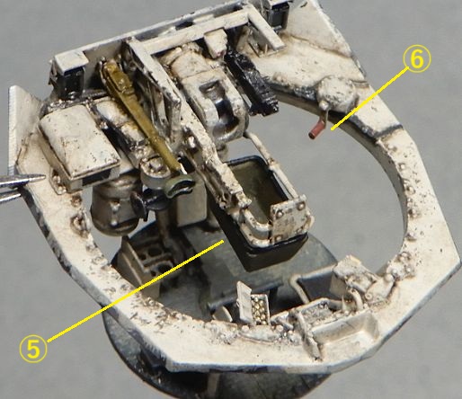 11 砲塔の製作 ハッチを開いてもほとんど見えないので、キットのままでもよかったのですが、気になる部分を少しだけ修正しました。 @ 砲の上下ハンドルと横のボックス間のステーを削除 また、砲塔床面は床の他の部分と同じくグレーとし、上側はエルフェンヴァイン(RAL1001)としました。 |