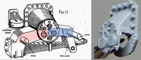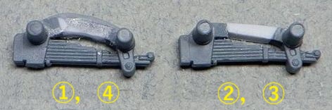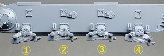 | 3 足回りの改造A @とCのサスは2本のアームがハの字型に狭まって伸びた状態にして、AとBは逆に水平に近く広がってサスが縮んだ状態を再現して、スキャンメルの傾斜路にフィットするように調整しました。 いったんパーツはバラバラのままで転輪などの塗分けをします。 |