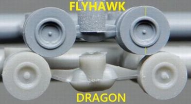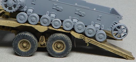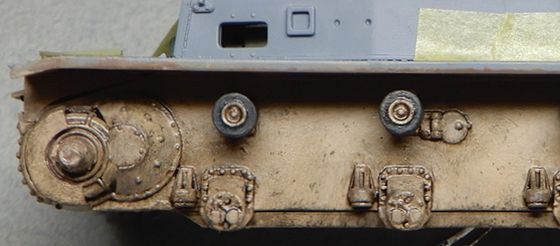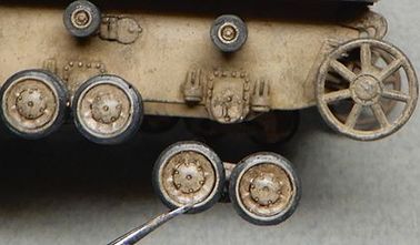 | 10 転輪の接着 まず転輪をボギーに接着したものを作っておいてから、車体に転輪セットを接着しました。 上部転輪はフライホークのパーツはなぜかセンターがずれていて使えないのでドラゴンから流用しました。 |