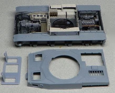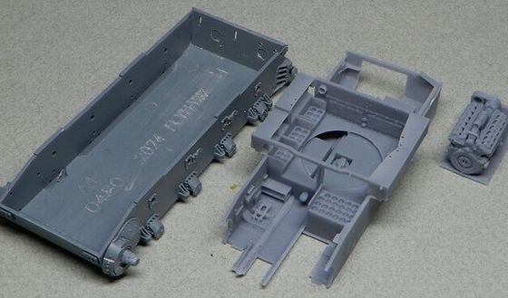 | 4 内装の製作@ 内装は、パンターのカットモデルでも使った、「安心と信頼の日本製」自作野郎さんの3Dプリント製インテリアキットを使いました。 自作野郎さんのHPはこちら(組立説明があります) 素材がガラスっぽい感触で割れやすいこのキットには、破損しやすいパーツは予備が入っています。 |