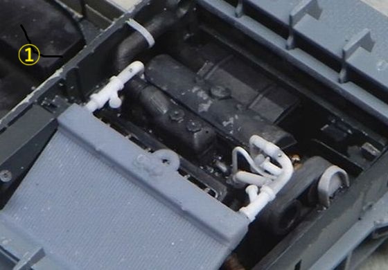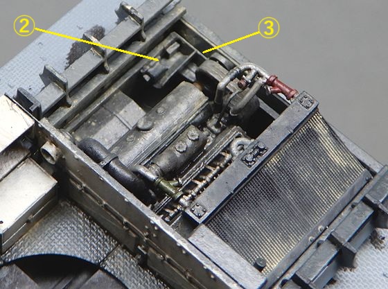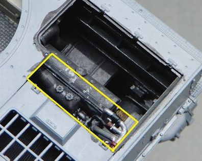 | 6 内装の製作B 車体後部 @ エンジンまわりの配管を追加 A 側面の補器を追加 B 後部パネルは3Dパーツとキットが2重になっているので、1枚に見えるように3Dパーツの後端をカット 車内が赤いおなじみのプライマー色の内装は1943年の通達によって変更されたので、1942年製の今回の車両ではまだ車内の下半分はグレー(RAL7009)が指定色だった時期なので、エンジンルームも同色にしました。ちょっと色合いが新鮮ですね。 資料はこちらの本のカラーチャートを参考にしました。同じグレーでも、AKとかファレホはもっと緑がかっている感じですが、私は青っぽいイメージだったので。色には諸説ありますので、まあ、ひとつの参考として見てもらえればと思います。
