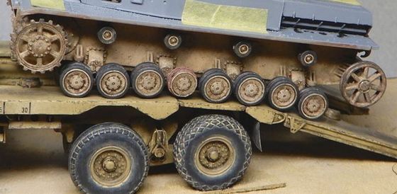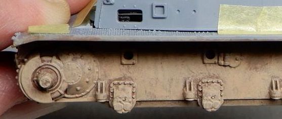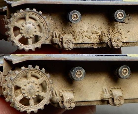 | 9 車体の製作B 今回は砂漠なので転輪の奥が泥でびっしりと埋まっているという事はないので、車体側面の汚しもあっさりと進めます。 施してみると、表面が少しつや消しでザラザラしたなあ…という程度の変化なのですが、何もしないよりは情報量が増えたような気がします。(気のせいかも) |