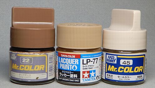 | 8 車体の製作A 足回りの工作を進めるため、まずは車体の下半分を塗装しました。 タミヤラッカーは、スプレー缶はクレオスのラッカーとは混ぜることができませんが、瓶のほうは同じタミヤラッカーでも成分が違うのかクレオスと混ぜて使うことができます。 塗装が乾いたら、転輪をつける前に油彩で墨入れをしてしまいます。 |