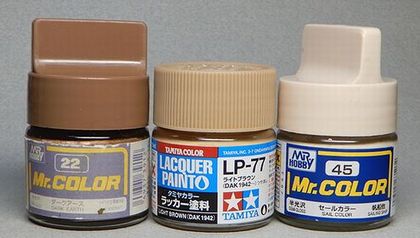 | 1 車体の塗装@ タミヤとクレオスのラッカーを混ぜていきますが、車体の下側ですでに問題ない事を確認済ですので、車体上面も同じように塗っていきます。 フライホークは細かいパーツが多いので、塗装で埋もれてしまうとか、筆があたって折れてしまうとかという事を考え、どこまで先にパーツをつけてから塗装をするか迷いました。 @ 下地〜MrカラーbQ2 ダークアース 最初から最後の色だけ塗れば済むんじゃないの?…という考えもあるかもしれませんが、やはりラッカーを重ね塗りして色が混じる(泣く)ことで色味が深まると思いますので、このような方法をとり続けています。 |