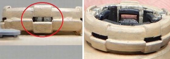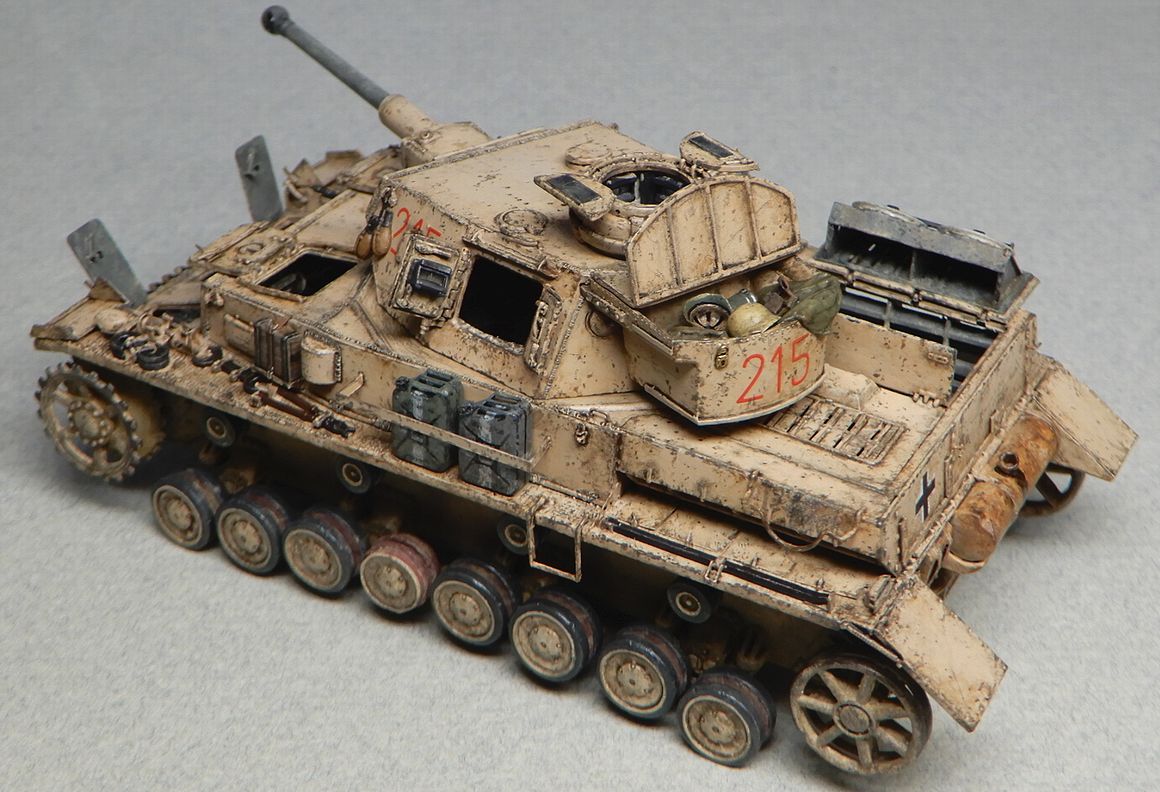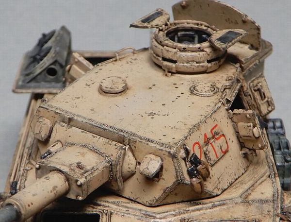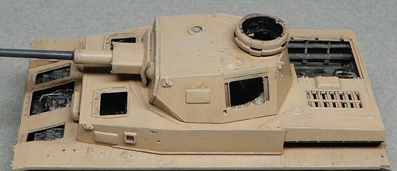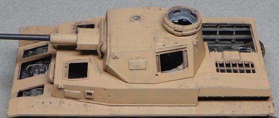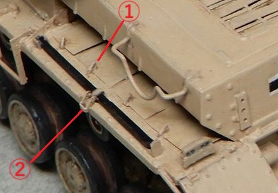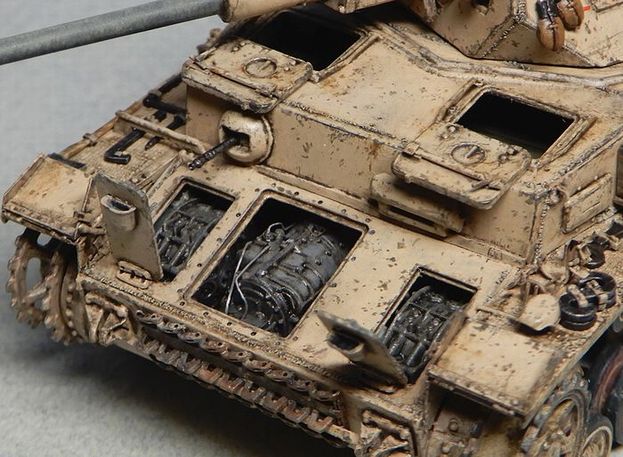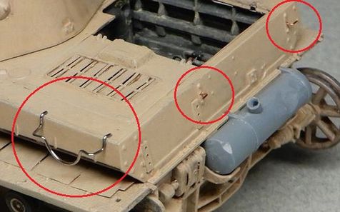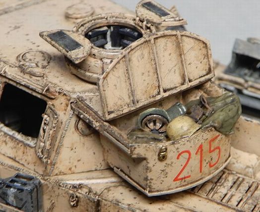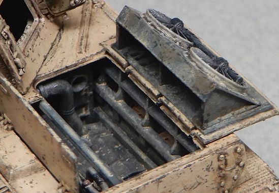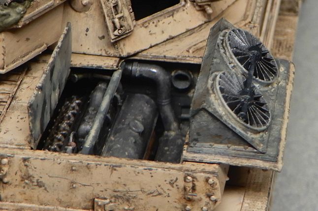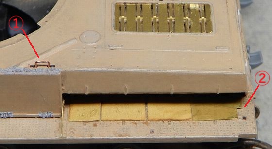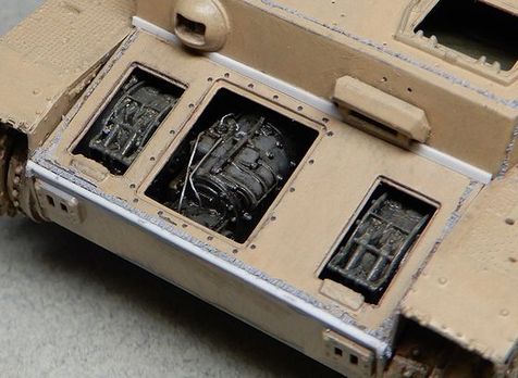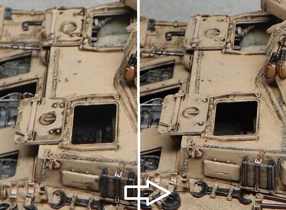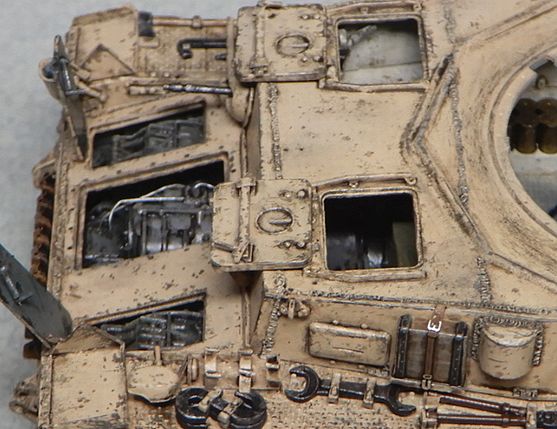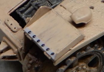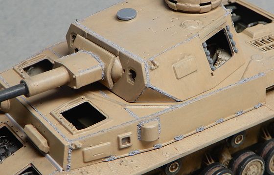 | 11 仕上げ作業B 砂の再現 色の濃いパネルの裏面は、黒で墨入れをしても効果がないので、ウエザリングカラーのサンドで墨入れをして、形状や輪郭をはっきりさせました。 この部分は地色が濃いのでハゲチョロはジャーマングレーで描き、そのうえに油彩の墨入れ、エナメル茶色での面のアクセントと重ねたうえにさらにウエザリングカラーを凹部に流しこみました。 仕上げ作業の4つ全ての作業がフルコンボされるとこんな感じに仕上がります。 |