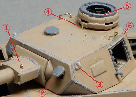 | 3 パーツの追加@ 砲塔 ここからは「アハトゥンク・パンツァー」と首っ引きで、1942年4月生産車としての仕様を確認しながら再現していきます。 今回買ったキットには、本来は別売りのペリスコープセットがおまけでついていたので、もちろん利用させてもらいました。 キューポラからチラリと見えるだけですが、正面を向いたペリスコープのガラス面には内側に縦線を描きました。外側からもチラリと見えるので、情報量が増していい感じになりました。(自己満足) @ 0.2ミリ径の銅線で輪っかを追加 A 開いた状態を再現(ステーは短くカットしました) B 吊り下げフックは一体成型だったので、先端部だけプラ板でリセット C エッチングの直接照準器(失くした時のために予備も含めて2ケついています。親切) D キューポラは周囲に排水用の穴を追加 E 雨どいは0.14ミリ厚プラ板でリセット |