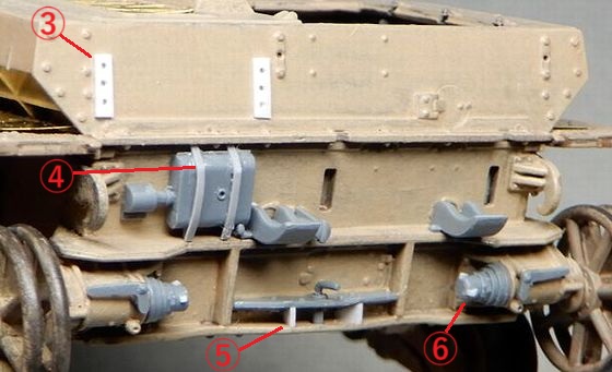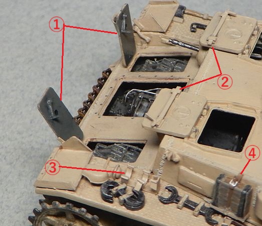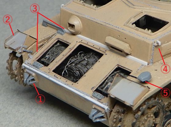 | 5 パーツの追加B 車体後部 @ 0.2ミリ径銅線で手すりを追加(基部の左右の出っ張りは伸ばしランナー) A 吸気部のフタは説明書で左右を間違っているので修正 B 煙幕発生装置は車両の生産時期を考え台座だけ再現 C 補助エンジンのマフラーは固定バンドをプラ板でリセット D 上下2枚の横板は断面を薄くし、縦板はプラ板でリセット E 張力調整器の先端は小さな突起を追加、L字のパーツは薄くしました。 さらにこのあと、車体後部の牽引ワイヤー固定用のL字金具を0.2ミリ径銅線で追加し、車体側面には予備転輪ラックも追加しました。(このラックは最初からこの形に曲げられていたものです。何のキットのだったかなあ。) |