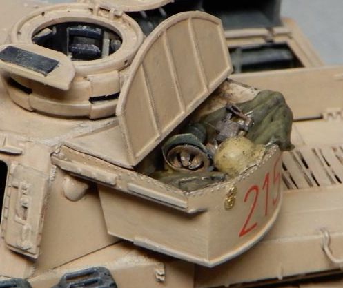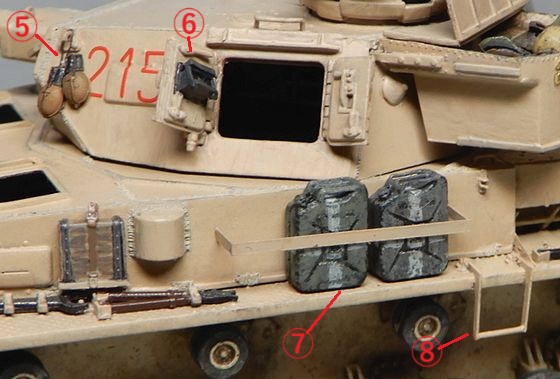 | 6 パーツの追加C 車体前部 追加したパーツをリタッチの要領で塗装したあと、別に作っていたハッチなどの出っ張ったパーツを追加しました。 @ 作業途中での破損を防ぐため切り離してありましたが結局プラ板で作りなおしました。 A 前方ハッチ裏面の開閉機構は単なるモールドだったのでプラ板で立体的に作りなおしました。 B 消火器は台座の金具だけ再現しました。 C 固定ベルトは余ったエッチングのバックルを使いました。 D アクセントに水筒を2ケぶら下げました。 E 側面ハッチにはキューポラ同様ペリスコープセットの透明パーツを追加しました。 F プラ板でラックを作りジェリ缶を載せました。 G 昇降用金具をプラ板で自作し、開いた状態で再現 また、前フェンダーの裏面にヒンジ金具のリベットを追加しました。