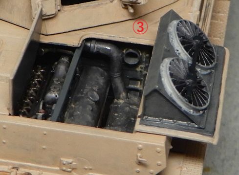 | 7 パーツの追加D 車体後部 @ 機関部側面のフタを固定するレバーもプラ板で作りました。 A バールの固定金具中央の取っ手はエッチング B ハッチ、冷却ファンともに自作野郎さんのインテリアキットに含まれているパーツです。 また、雑具箱下端の木製ガードは細かくリベットも再現されていますが、厚すぎるので薄くしました。リベットを犠牲にして薄くするほうをとりました。 |
