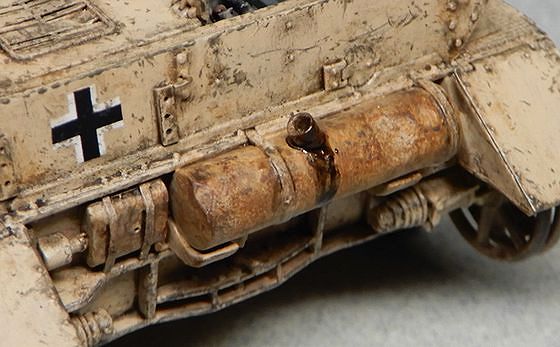 | 12 仕上げ作業C 油汚れの再現 後部のマフラーは、排気だけでなくオイルの噴出などもあったと思われることから、アクセントとしてベタベタしたオイルを再現しました。 これは、いったんエナメルの黒で流れた跡を描いた上から、アクリルのスモークを重ねることで、ツヤのある粘度の高い汚れたオイルを表現しました。 |